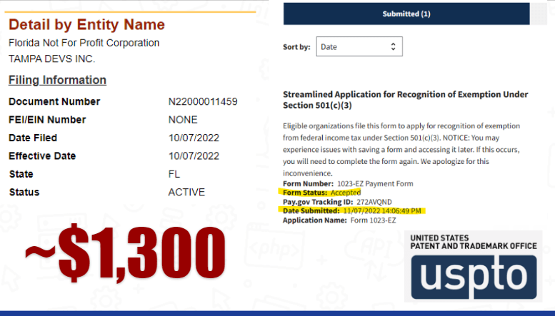 In addition, we incurred expenses related to incorporating Tampa Devs as a nonprofit organization and applying for 501c3 Nonprofit status, as shown below: