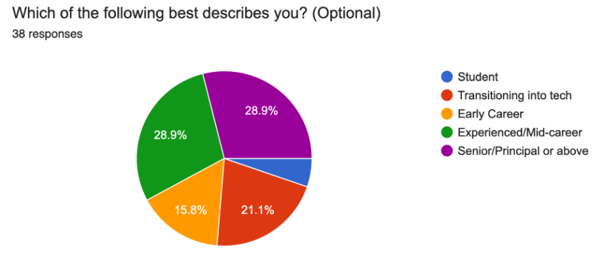 Our Slack instance has been buzzing with activity, with over 33,000 messages exchanged since we started. We've also compiled a breakdown of the demographics of our attendees, which can be seen below.